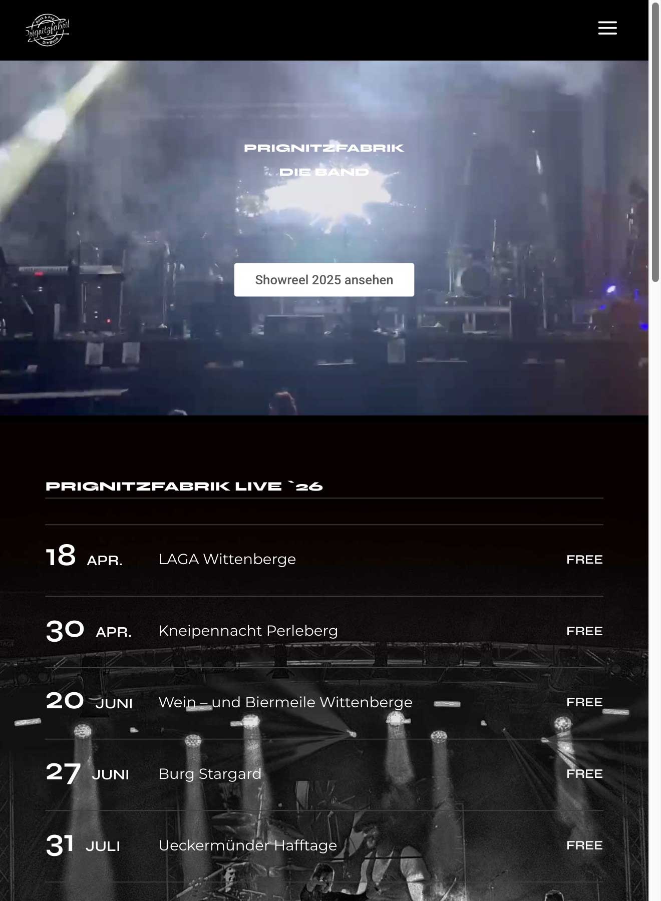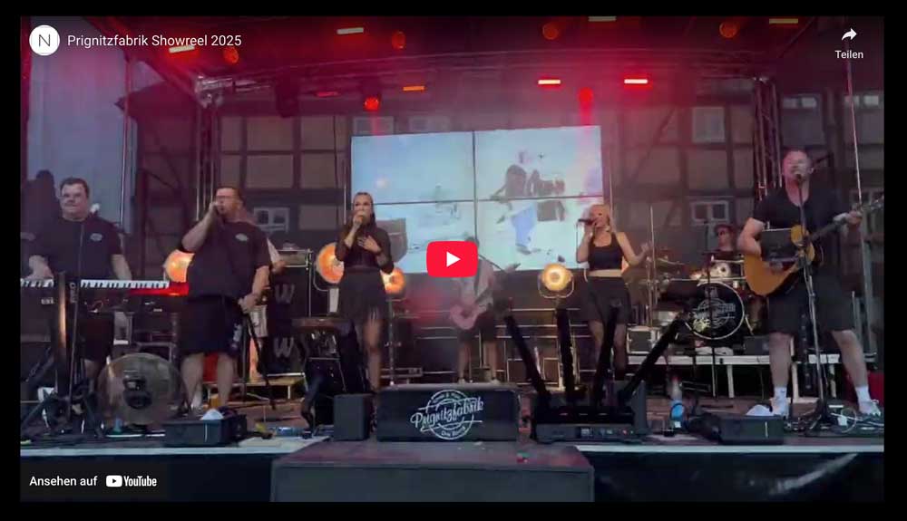 Die Website der Prignitzfabrik haben wir als fokussierten Booking Funnel aufgebaut, schnell erfassbar, visuell stark und klar auf Anfragen von Veranstaltern ausgerichtet. Schon im Einstieg sitzt die Brand Message. 100 Prozent live, 100 Prozent Show, inklusive Show Setup mit LED Wall, Nebel, Konfetti und Pyro, plus dem klaren Versprechen echter Livepower. Das Herzstück ist das von uns produzierte Video Showreel 2025. Auf der Startseite läuft es als Hero Hintergrund bewusst ohne Ton, um sofort Atmosphäre und Energie der Band sichtbar zu machen, ohne den Nutzerfluss zu unterbrechen. Ein klarer Link darunter führt direkt zur Media Seite, auf der das Showreel in voller Länge eingebunden ist. Strukturell basiert die Seite auf einer sauberen Informationsarchitektur mit kommenden Dates als klarer Timeline für Verfügbarkeit und Planung. Die Band Seite stellt das Team als Crew vor, inklusive Rollenprofilen wie Music Director, und macht Professionalität auch backstage sichtbar. Ein News Bereich ergänzt das Setup als laufender Content Hub für Updates, Recaps und Reichweite.
