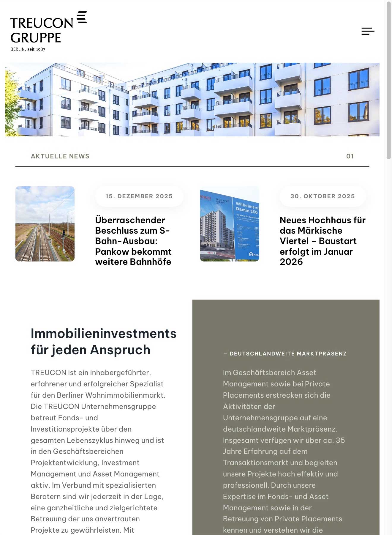 Für die TREUCON Gruppe haben wir den Webauftritt konsequent nach CI Vorgaben umgesetzt, mit einem klaren, seriösen Look und einer UX, die Entscheiderinnen und Entscheider schnell zur relevanten Information führt. Herzstück ist das Projektportfolio: Alle 145 Projekte sind strukturiert aufbereitet und als Case Library inszeniert, sodass Referenzen sofort vergleichbar und überzeugend sind. Parallel haben wir ein monatliches News Format etabliert, das relevante Themen aus dem Berliner Bausektor aufgreift und als Content Marketing Sichtbarkeit und Markenautorität stärkt. Ergänzend sorgt präziser Leistungscontent dafür, dass Angebot, Kompetenz und Mehrwert der TREUCON Gruppe auf den ersten Blick verständlich werden.