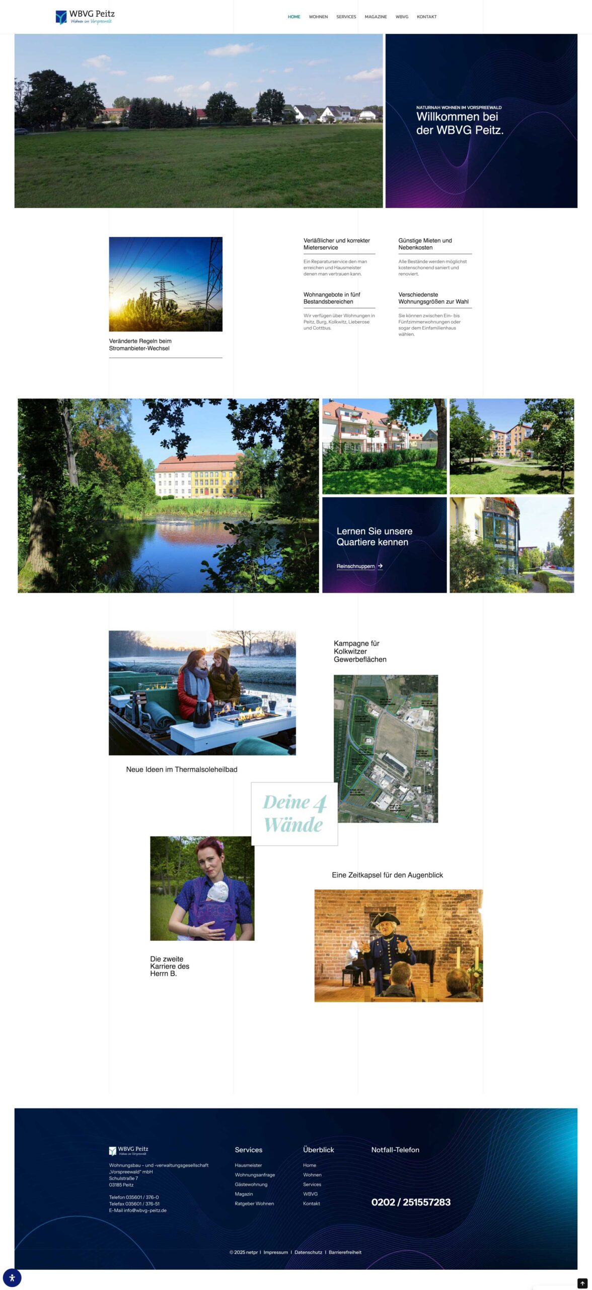 Für die WBVG Peitz haben wir einen Markenauftritt geschaffen, der den Vorspreewald als Lebensraum fühlbar macht. Im Mittelpunkt standen die Ruhe der Region, die vielen Seen und Fließe und die besondere Lebensqualität, umgesetzt in einer authentischen, entschleunigten Bildsprache mit echter Emotionalität. Herzstück ist eine barrierefreie Website, die Information und Atmosphäre sauber verbindet. Großflächige Landschaftsmotive, präzise geschnittene Drohnenvideos und eine klare UX Struktur sorgen für schnelle Orientierung und gleichzeitig für Nähe zur Region. Ergänzend entstand ein A4 Magazin, das Menschen, besondere Orte und ausgewählte Projekte aus dem Vorspreewald porträtiert. Als redaktionelle Markenbühne wirkt es im Print und läuft als Digitalmagazin auf der Website weiter. So entsteht ein stimmiges Zusammenspiel aus Print, Digital und Visual Storytelling.